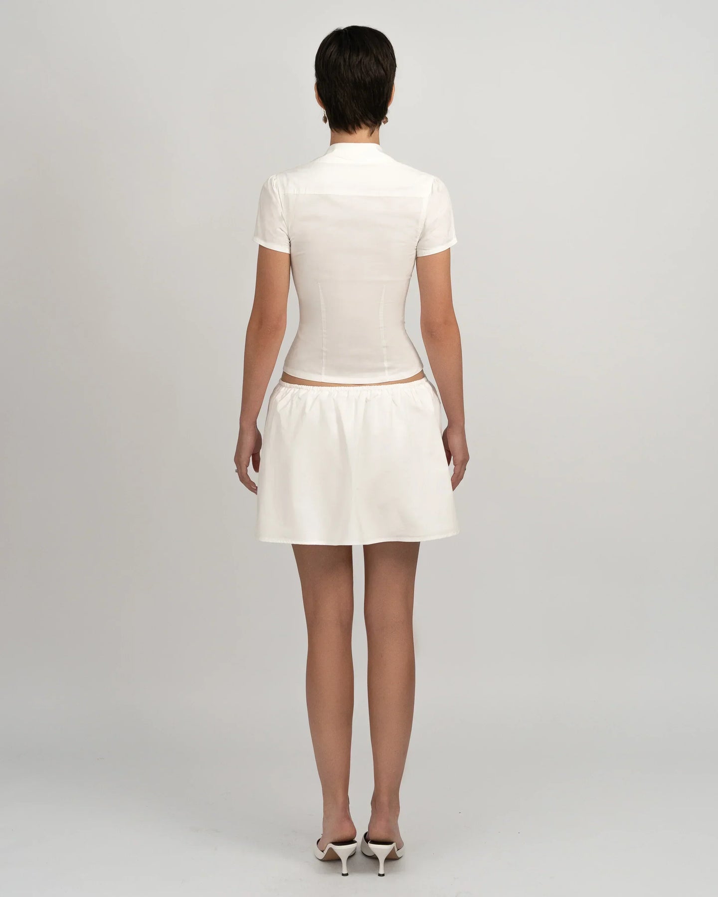 Alba incarne la pureté et la sophistication minimaliste. Cet ensemble deux pièces comprend un haut cintré à décolleté profond et une jupe courte fluide, pour une silhouette à la fois structurée et délicate. Son design épuré en fait une tenue idéale pour un événement estival, un brunch élégant ou une soirée habillée en toute simplicité.