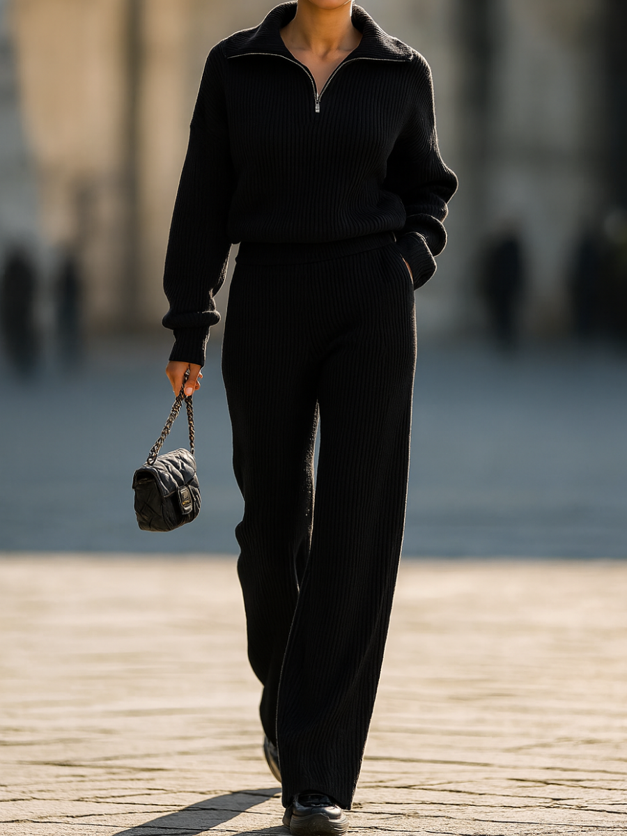 Cet ensemble côtelé deux pièces de luxe associe confort et style dans une seule tenue. Son mélange maille innovant avec une élasticité confortable est doux, souple et accompagne chacun de vos mouvements. La demi-fermeture éclair subtile et la coupe droite apportent une allure moderne et élégante – parfait pour se détendre à la maison ou sortir avec style.